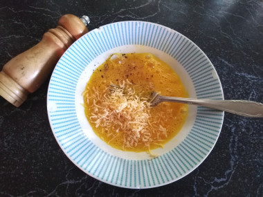 Яйцо вбейте в миску. Обязательно мойте яйца перед использованием, так как даже на кажущейся чистой скорлупе могут находиться вредные бактерии. Лучше всего использовать моющие средства для пищевых продуктов и щетку. Слегка взбейте его вилкой до однородности. Добавьте немного соли и молотого черного перца. Учитывайте, что яйцо потом смешается с сыром, который также содержит соль, не пересолите. Снова перемешайте яйцо.