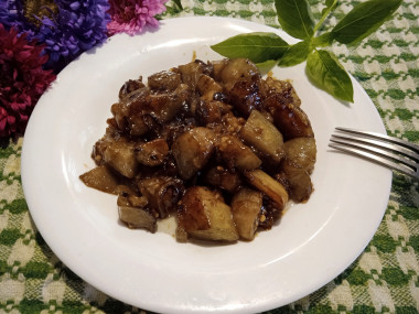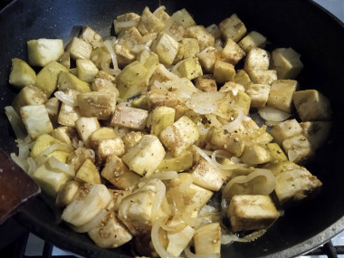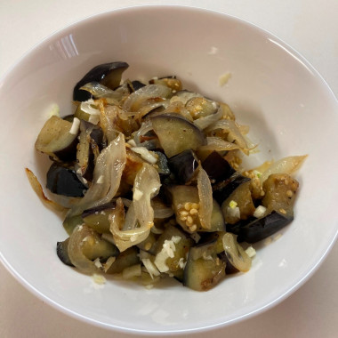 Рецепт очень простой в приготовлении. Сначала баклажаны я порезала и присолила. Затем обжарила лук с баклажанам, как описано в рецепте. От себя добавила бальзамический соус. Прогрела всё вместе на сковороде и вуаля!
