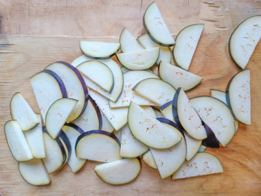 Баклажаны вымойте и срежьте хвостики. Нарежьте их небольшими кусочками. Это могут быть брусочки, кубики, кружочки, полукружья. Отправьте измельчённые баклажаны в глубокую чашу, посыпьте небольшим количеством соли (примерно 0,5 ст.л.) и залейте холодной водой. Накройте сверху плоской тарелкой, чтобы баклажаны не всплывали и полностью находились в подсоленной воде. Оставьте таким образом на 20-30 минут. Данная процедура позволит убрать горечь из баклажанов.