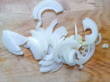 Репчатый лук очистите от шелухи и нарежьте тонкими полукольцами или четверть кольцами. Чтобы при нарезке не слезились глаза, периодически смачивайте нож в холодной воде.