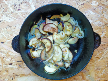 Когда баклажаны будут готовы, посолите жареные баклажаны по вкусу. Поперчите и посыпьте чесноком, пропущенным через пресс или нарезанным от руки мелко. Всё перемешайте, выключите огонь и оставьте на 2-3 минуты под крышкой.