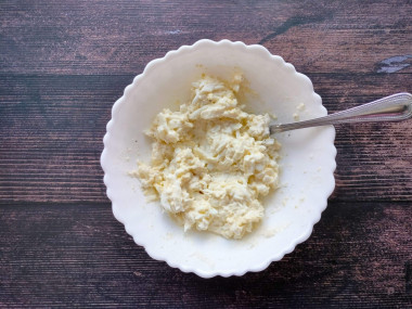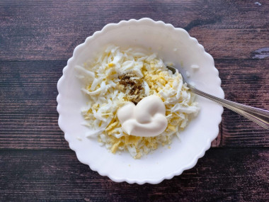 Яйца предварительно отварите вкрутую. Остудите и очистите их от скорлупы. Натрите яйца на крупной терке. Сложите их в миску. Для большей остроты можете добавить к яйцам немного чеснока.
