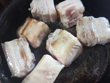 Сковороду разогрейте до горячего состояния и налейте немного растительного масла. Выложите подготовленную грудинку и обжарьте её со всех сторон на сильном огне.