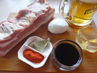 Как сделать свиную грудинку в пиве на сковороде? Подготовьте для этого необходимые ингредиенты. Свиную грудинку выбирайте с наибольшим количеством мяса. Можно взять даже с рёбрами. Нарежьте грудинку на кусочки, более удобные по размеру сковороды. Пиво для тушения подойдет любое - тёмное или светлое. Мне больше по вкус светлое пиво - именно его я и беру.