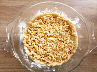 К этому времени в морозилке уже застыл меньший кусочек теста. Натрите его на крупной терке по всей поверхности пирога. Поставьте пирог в духовку, предварительно разогретую до 180 градусов, на 30-40 минут.