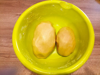 Постепенно подсыпайте муку и замесите тесто. В количестве муки ориентируйтесь по консистенции теста. Оно получится мягкое и не будет липнуть к рукам. Муки может понадобиться чуть больше или меньше, чем указано в рецепте. готовое тесто разделите на 2 неравные части. Меньшую часть уберите в морозилку на 1 час, чтобы оно застыло.