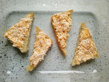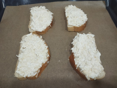 Возьмите противень и застелите его бумагой для выпечки. Куски батона намажьте сырной массой. Не надо делать слишком толстый слой, "с горкой", опять по той же причине — в духовке это все стечет с куска хлеба. Выложите бутерброды на противень.
