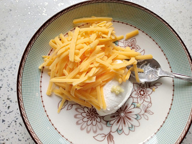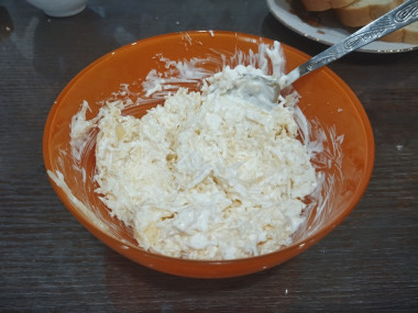 Зубчик чеснока очистите от шелухи. Выдавите его через пресс в миску к сыру. Добавьте майонез и хорошо перемешайте массу до однородности. Количество майонеза может понадобится разное — это будет зависеть от сыра. Смотрите, чтобы намазка не стала слишком жидкой, иначе она может потечь в духовке.