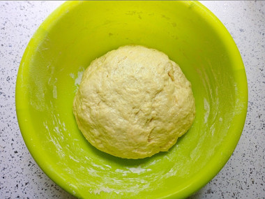 В чашу постепенно подсыпайте просеянную муку и замешивайте тесто. Всыпать сразу всю муку не надо. Её может понадобиться чуть больше или меньше от указанного количества. Ориентируйтесь по консистенции готового теста. сначала замешивайте тесто в чаше. Затем, когда оно станет гуще, выложите его на стол и продолжайте месить руками. В конце замеса смажьте руки растительным маслом и помесите тесто еще немного.