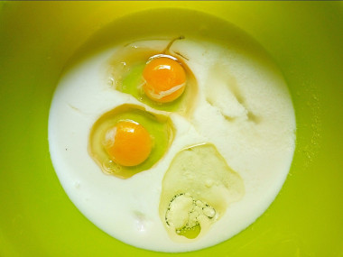 Кефир нагрейте до теплого состояния и влейте в чашу. Затем добавьте растительное масло и яйца. Все ингредиенты смешайте между собой.