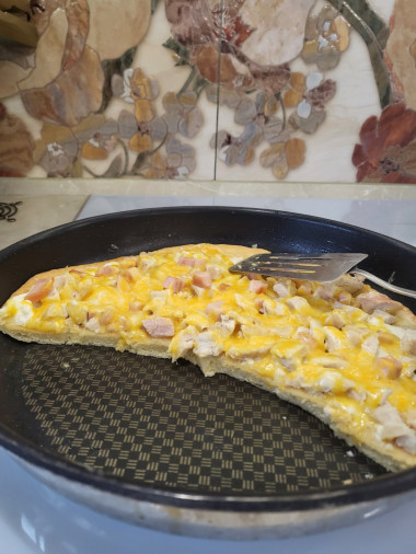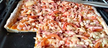 Мы уже соскучились по пицце, пришлось печь новую. Не нашла рецепт с нужной мне начинкой, поэтому выбрала рецепт теста для пиццы на кефире без дрожжей. А начинку придумала сама, это удобно) Тесто мне в работе очень понравилось, с ним легко работать, оно мягкое, эластичное. После "отдыха" стало ещё более податливое. Судя по количеству продуктов сразу поняла, что пицца получится большой. И это хорошо, все покушают досыта) Так и вышло, основу я растянула руками практически на весь большой противень. Толщина получилась не маленькая. Готовая пицца вышла пышной, основа мягкая, пористая, хорошо пропеклась. Мне этот рецепт понравился, возьму его на заметку и всем советую.