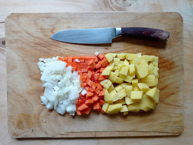 В это время очистите картошку, оставшуюся луковицу и морковку от кожуры. Овощи ополосните.