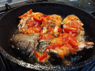 Овощи( я брала лук, морковь, помидоры и перец) порезала и обжарила на сковороде. Убрала овощи в тарелку. В этой же сковороде обжарила нарезанную рыбу с двух сторон.