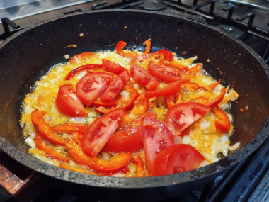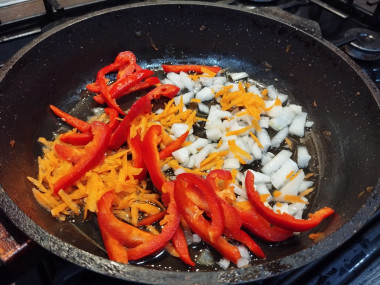 В сковороде разогрейте небольшое количество растительного масла. По необходимости его количество можно чуть увеличить. Отправьте лук и болгарский перец обжариваться. На сильном огне, постоянно помешивая, готовьте до появления золотистого оттенка лука.