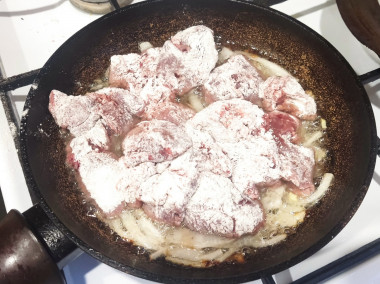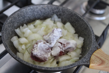 Затем выложите в сковороду печень, обвалянную в муке. Перемешайте.