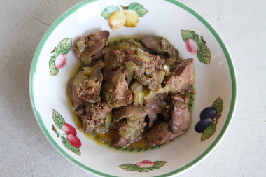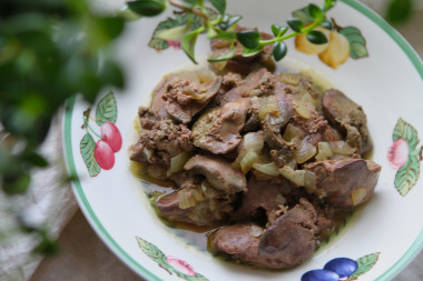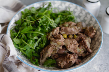 Подготовив все ингредиенты, обжарив по очередности лук, печенку, я влила в сковороду немного куриного бульона и потушила печень под крышкой 15 минут. Она получилось мягкой. Сок от бульона можно добавить в гарнир, для сочности. Я подавала печень с листьями руколлы.