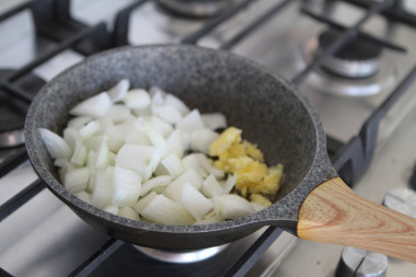 Сковороду для жарки разогрейте до горячего состояния и налейте немного растительного масла. Выложите в сковороду нарезанный лук и обжарьте его в течение минуты до прозрачности.