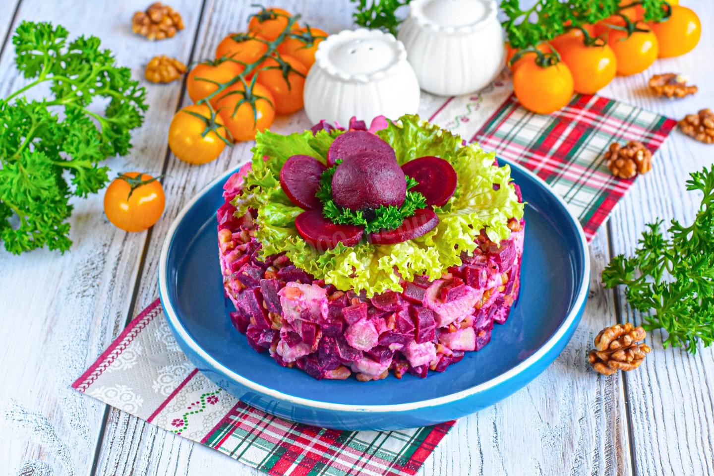 Шаг 1. Как сделать классический салат с курицей свеклой и грецким орехом?
