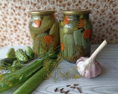 Как сделать огурцы маринованные кисло-сладкие на зиму? Подготовьте все необходимые ингредиенты. Огурцы промойте, обрежьте кончики и замочите в холодной воде на 2-3 часа. Благодаря этому они получатся хрустящими Очистите чеснок от шелухи и обмойте. Всю зелень также промойте и обсушите. Морковь очистите и обмойте. Подготовьте банки и крышки от них: промойте всё с содой и простерилизуйте любым удобным способом. Подробнее об этом читайте в конце рецепта.