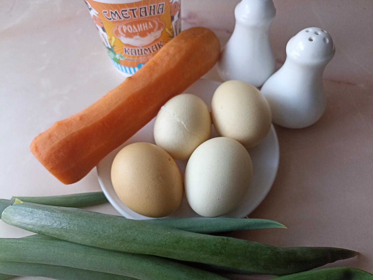 Как сделать салат из моркови, яйца и зелёного лука? Подготовьте все продукты, которые указаны по списку. Если у вас в холодильнике имеются заранее отварные морковка и яйца, то салат вы приготовите буквально за 5 минут.Шаг 2: