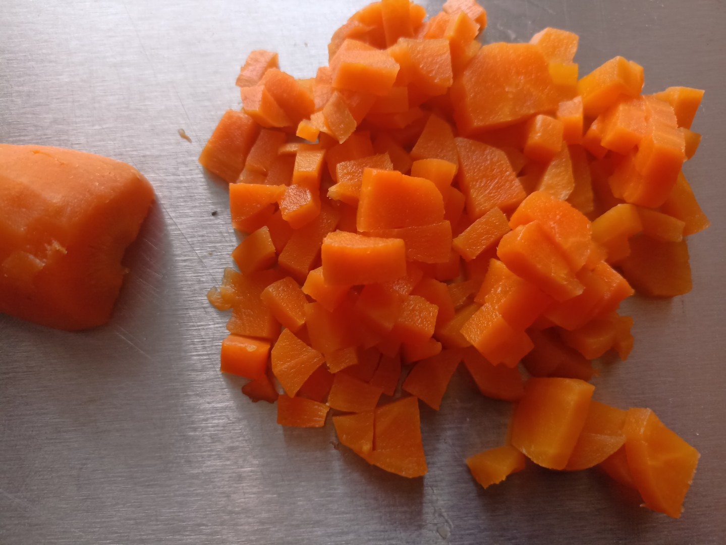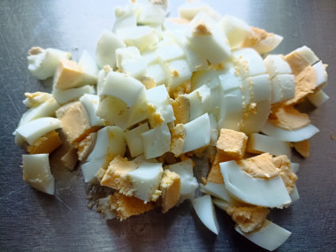 Яйца очистите от скорлупы и измельчите так же кубиками. Добавьте яйца к морковке.Шаг 7: