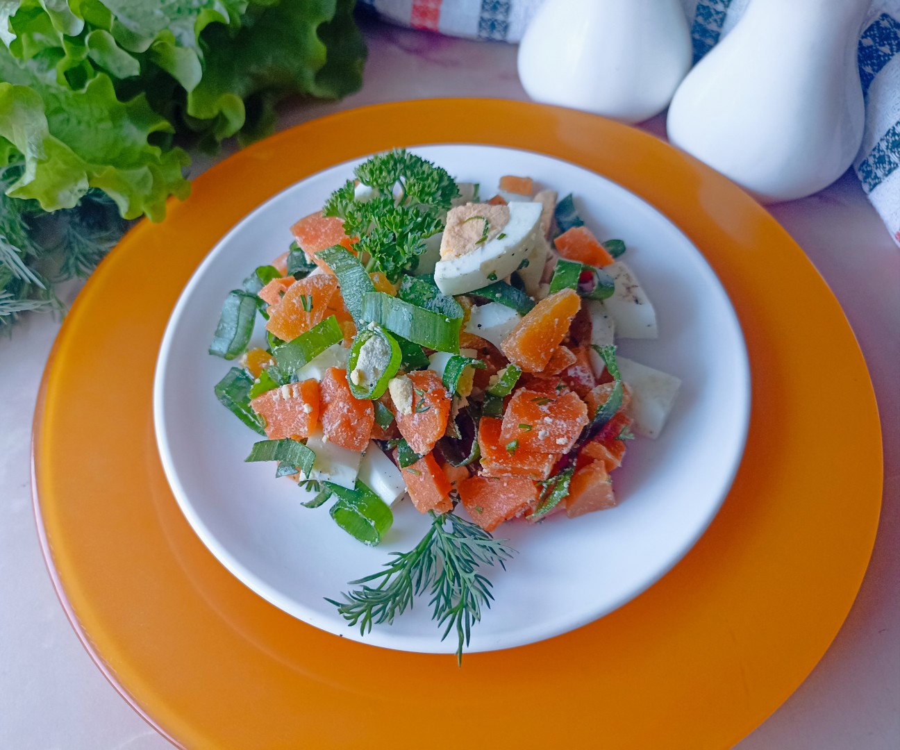 Обратила внимание на этот рецепт салата из-за его простоты и лёгкости приготовления. А ещё очень захотелось похрустеть свежим зелёным лучком) Для этого салата очень важно выбрать морковку, она должна быть яркая, сочная, сладкая. От нее будет зависеть вкус всего салата. Я взяла половину от нормы продуктов, получилось две небольшие порции. Яйца и морковь сварились быстро, залила их холодной водой, чтобы быстрее остыли и лучше чистились. А зелёный лук взяла с огорода, он как раз начал понемногу пробиваться. Мне понравилась нарезка яиц и морковки мелкими кубиками, а лука тонкими колечками, все очень гармонично получилось. Заправила 20% сметаной, солью и свежемолотым перцем. Очень вкусный салатик! Он нежный по консистенции и в то же время имеет сладко-острый вкус. Мне понравилось такое сочетание.