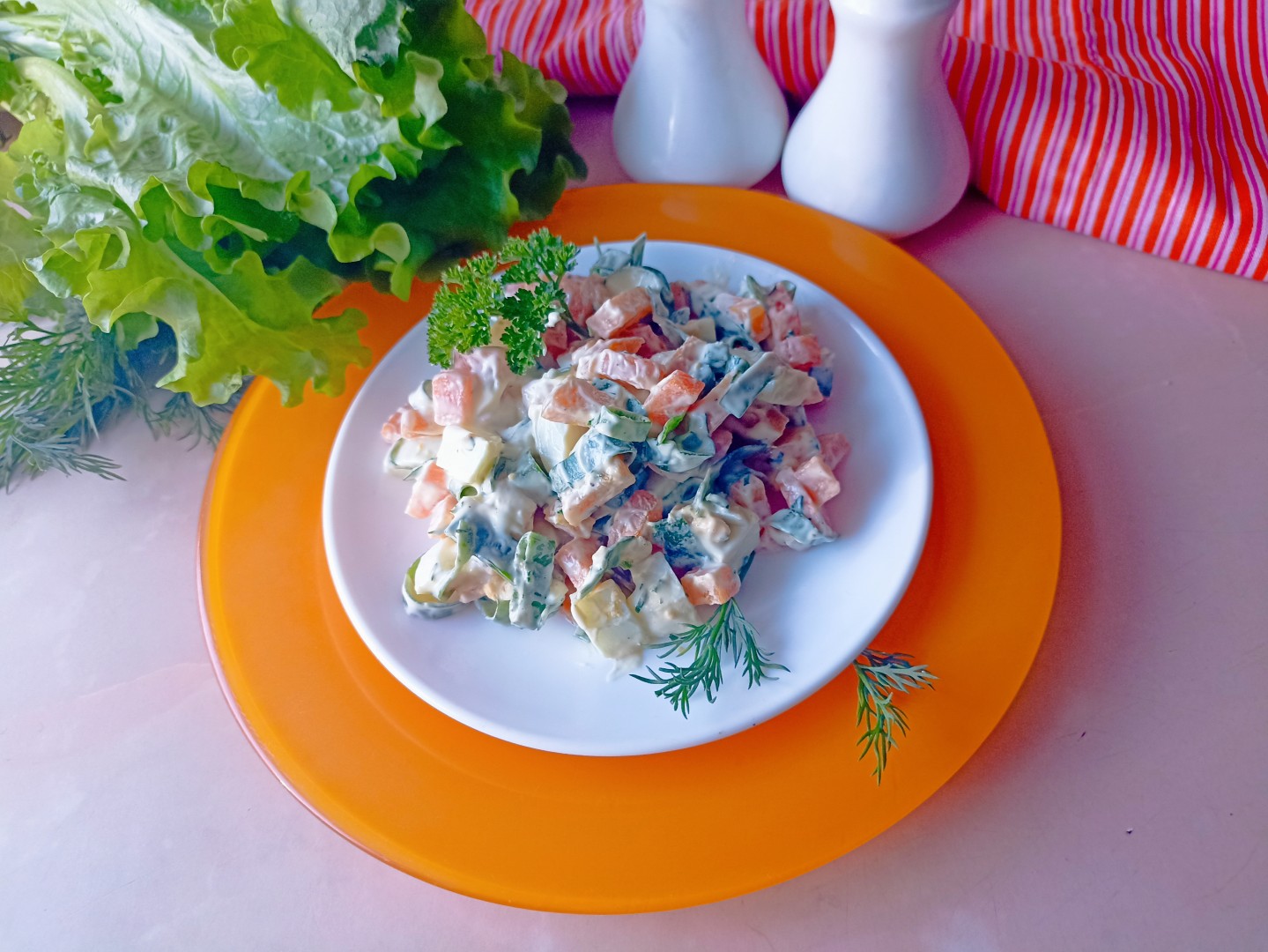Для приготовления салата яйца морковь лук нарезала все ингредиенты, перемешала, присолила и поперчила по вкусу. Сметанная заправка делает вкус готового салата более мягким, для получения более пикантного вкуса я решила использовать майонез. Салат получается ярким, сытным, вкусным, хотя готовится из самых доступных ингредиентов. Спасибо автору за этот рецепт!