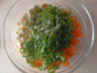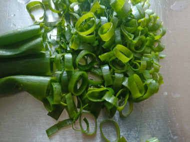 Зелёный лук ополосните и обсушите бумажными салфетками. Количество зелёного лука отрегулируйте по своему вкусу. Вместо перьев репчатого лука можно использовать шнитт лук и даже лук порей. Отправьте лук в салатницу.Шаг 8: