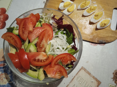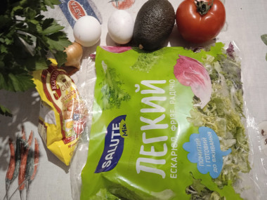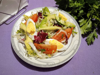 Салат с авокадо и яйцом - это восхитительно просто и невероятно вкусно. Отличное описание в рецепте, очень доступное. Подготовила я салатный микс из эскариолы, радичио и фризе. Отварила яйца вкрутую. Почистила авокадо. Порезала помидор, авокадо и яйца дольками. Свежую петрушку измельчила. Лук нарезала полукольцами. Соединила все ингредиенты в салатнице и вуаля. Салат готов. Проще простого. Только заправлять майонезом я передумала. Поэтому сбрызнула салат льняным маслом и посолила. Вышло не только красиво и аппетитно, но и полезно. Салат и хрустящий, и нежный, и сочный, и ароматный. Отличное сочетание продуктов. Такой салатик украсил наш стол и дополнил запеченную рыбку. Замечательный рецепт! Большое спасибо автору)