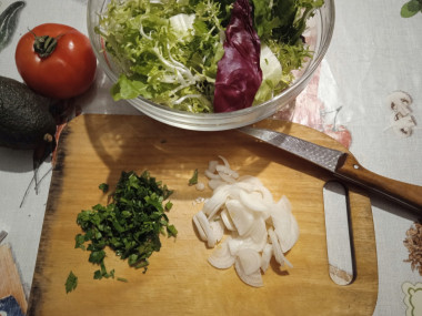Смесь салатных листьев можете взять готовую магазинную или сделать самостоятельно из той зелени, которая у вас есть.