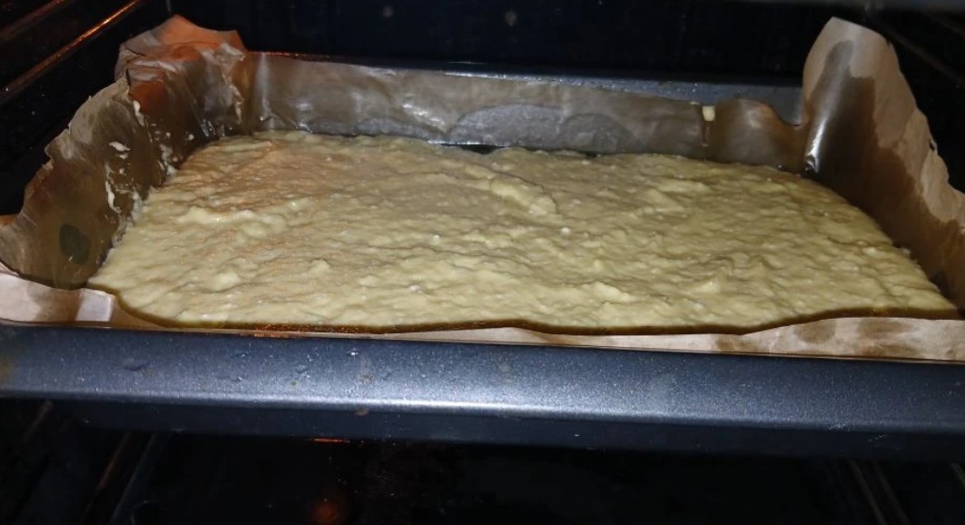 Форму для выпечки выстелите пергаментом и смажьте растительным маслом. Выложите в нее тесто и разровняйте. У меня форма размером 15 на 22 см. Если форма круглая, то подойдет диаметр 22 см. Поставьте пирог в разогретую до 170°С духовку на 45-50 минут. Во время выпекания дверцу не открывайте, иначе пирог опадет.Шаг 9: