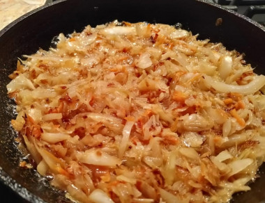 Отжимаем квашеную капусту и кладем ее к луку. Продолжаем жарить до образования золотистого цвета.
