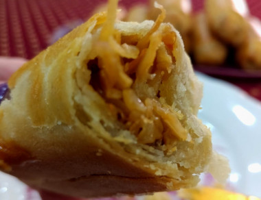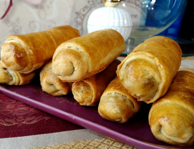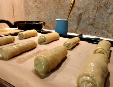 Вкусные пирожки, а главное, тесто быстро делается. За счет того, что тонкое тесто заворачиваешь рулетиком, оно получается как слоенное. Советую всем, когда хотите быстро приготовить пирожки.