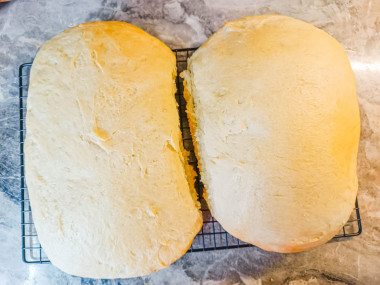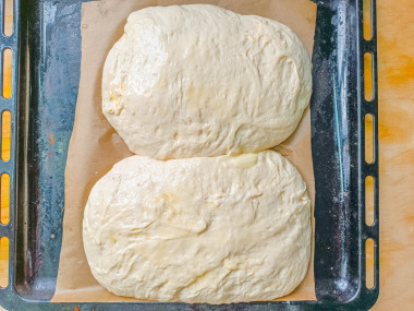 Муку я использовала высшего сорта с высоким содержанием белка. Для начала отмерила 700 граммов. После замеса добавила ещё 100 граммов. Тесто оставалось ещё немного липким, но больше муки добавлять не стала. Через 2,5 часа тесто увеличилось раз в 5. Разделила тесто на две части. Вторую часть не стала убирать в холодильник. В моей семье белый хлеб съедается быстро, поэтому решила испечь сразу много. Выложила тесто на противень, застеленный силиконизированным пергаментом (специальной формы для хлеба у меня нет), и оставила ещё на час.