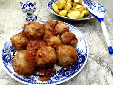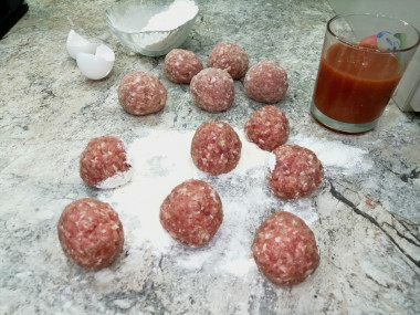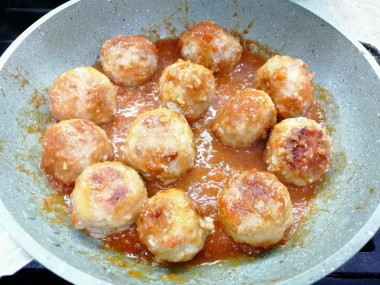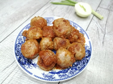 Сформировала из фарша тефтели, обваляла их в муке, жарила в разогретом масле до румяной корочки. Затем залила соусом, приготовленным из томатной пасты, соевого соуса и воды. Воды взяла столько, чтобы соус закрыл тефтели чуть выше половины. Соль в соус добавлять не стала.
