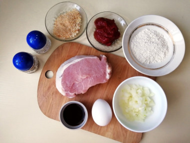 Как сделать тефтели без риса на сковороде с подливкой? Очень просто! Для начала подготовьте ингредиенты по списку. Фарш можете брать любой: свиной, говяжий, куриный или даже рыбный. У меня из постной свинины. Помимо соли и перца можете всыпать свои специи по вкусу.