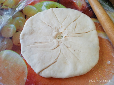 Тесто переверните и аккуратно, без сильного нажима раскатайте, формируя круглый пирог. В центре сделайте небольшое отверстие для выхода пара.