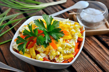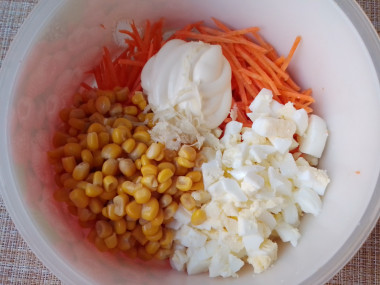 Морковь я натерла на терке для корейской морковки, добавила к ней нарезанные яйца и кукурузу из баночки. Чеснок натерла на мелкой тёрке. Заправляла салат я майонезом, добавила немного соли.