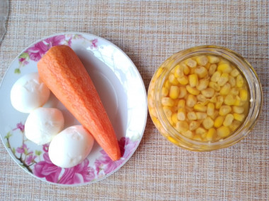 Как сделать салат из моркови, кукурузы и яйца? Подготовьте все продукты, которые указаны в рецепте. Для салата возьмите сочную сладковатую морковку.