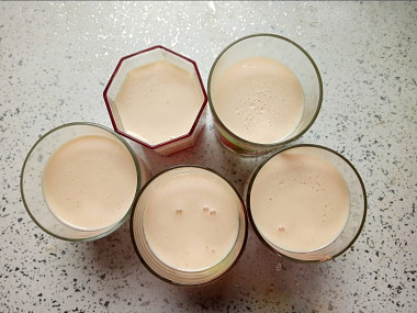 Разлейте получившуюся смесь по креманкам или стаканчикам. У меня кефирной смеси хватило на 2 креманки и 2 стакана, то есть на 4 порции. Поставьте десерт в холодильник на 1-2 часа до застывания. За это время масса станет плотнее.