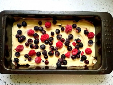 Поверх распределите оставшуюся половину ягод. Выпекайте пирог в разогретой духовке примерно 40 минут при 180°С. Затем оставьте пирог в выключенной духовке еще на 5-10 минут., чтобы верх зарумянился.