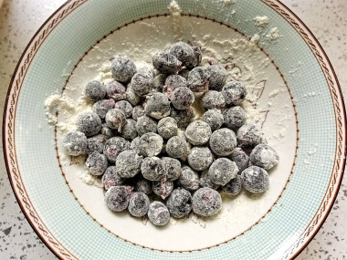 Ягоды, не размораживая, разделите на две равные части. Одну половину ягод присыпьте мукой. Вторая часть ягод понадобится для верха пирога.