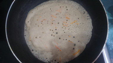Возьмите подходящую сковороду и поставьте на плиту, после чего смазывайте ее небольшим количеством растительного масла и нагревайте, затем берите половником необходимое количество теста в миске и распределяйте его в сковороде, после чего ставьте ее на плиту и обжаривайте блин на среднем огне порядка четырех минут с одной стороны.