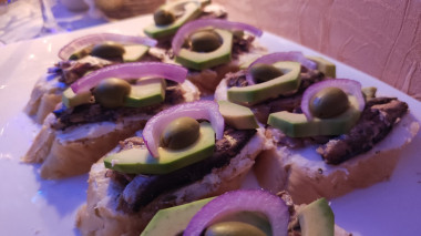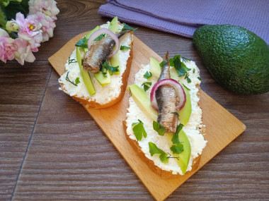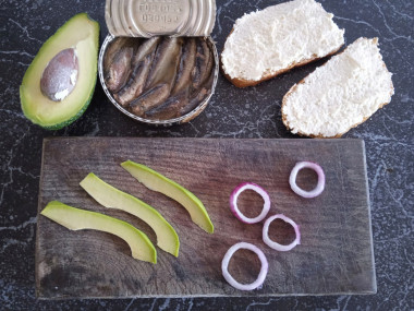 Очень интересные бутерброды меня заинтересовали своими составляющими. Обычно готовлю просто гренки со шпротами, а тут такая красота. Я не могла пройти мимо и не приготовить) Купила авокадо и шпроты, был красный лук, а вместо творожного сыра взяла плавленый по совету автора, он мне больше нравится. Оливки я совсем исключила, так как не люблю их. Хлеб взяла белый нарезной, мне со шпротами больше батон смакует, не обжаривала его. Плавленый сыр натерла, добавила пару капель молока, чтоб легче размазывался. Батон смазала сыром. Разложила дольки авокадо, шпроты, оформила колечками красного лука и зеленью петрушки. Это выглядит так празднично и так красиво!!! По вкусу бутерброды вышли великолепные. Лук идеально дополняет шпротинку, сыр прекрасно сочетается со всеми ингредиентами, а вот авокадо на фоне копчёных шпрот немного потерялось. В целом блюдо замечательное и очень украшает стол. Всем понравились бутерброды со шпротами на праздничный стол. Большое спасибо автору!