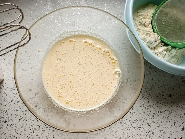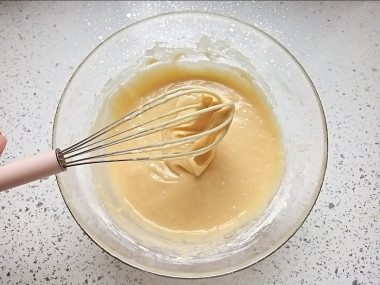 Хорошо перемешайте тесто венчиком, оно должно получиться однородным, консистенцией как негустая сметана.