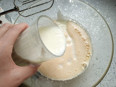 Кефир перелейте в емкость побольше и всыпьте в него соду. Перемешайте и оставьте постоять, пока смешиваете другие ингредиенты. За это время кислота, содержащаяся в кефире, вступит в реакцию с содой, за счет чего выделится углекислый газ, который и поднимет бисквит при выпечке. Учитывайте, что кефир увеличится в размере, берите мисочку побольше.