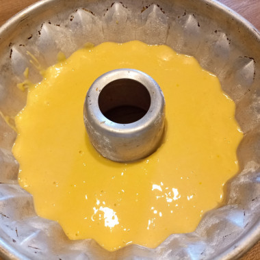Возьмите форму для выпечки. Смажьте ее небольшим количеством растительного масла (если форма силиконовая, смазывать не нужно). Я пекла пирог в кольце d20см, вместо дна использовала фольгу. Вылейте в форму тесто.