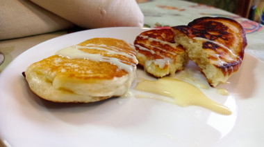 Тесто получилось густое и тягучее. Печь из него одно удовольствие. Оно не растекается, не пригорает. Я выпекала оладушки на среднем огне примерно по одной-полторы минуты с каждой стороны.