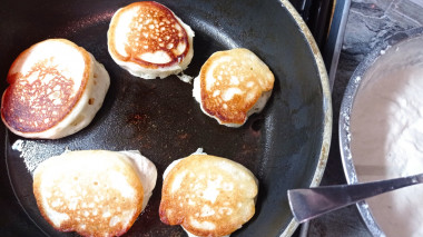 Столовой ложкой (достаточно одной на одну оладушку) выкладываем на разогретое масло тесто. Заполняем всю сковороду заготовками оладушек. Когда тесто схватится, убавляем огонь до среднего. Даем оладьям прожариться с одной стороны. Когда сверху в тесте начнут появляться дырочки, значит, пора оладушки переворачивать.
