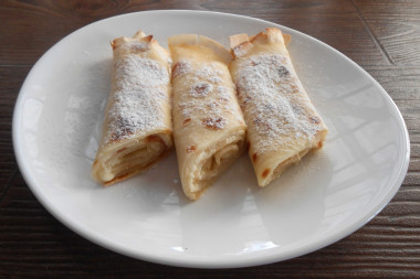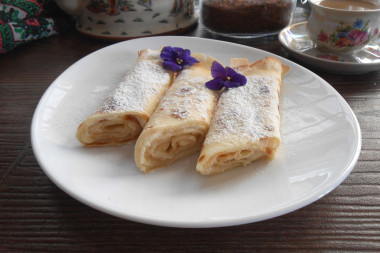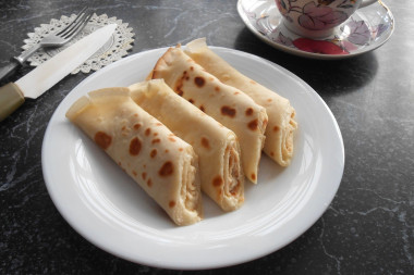 Творожная начинка вышла хорошей консистенции, не густая и не жидкая. Блинчики смазывала тонким слоем начинки и сворачивала в трубочку. Для удобства каждую трубочку разрезала пополам.